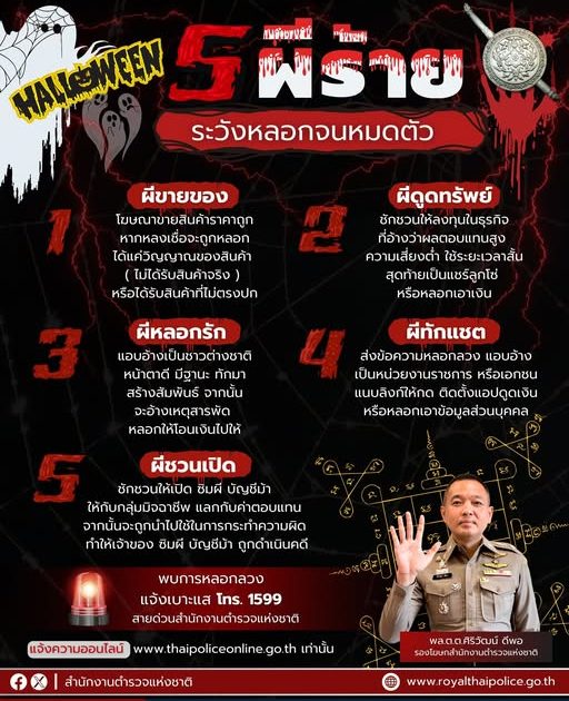 สำนักงานตำรวจแห่งชาติจึงขอเตือนระวังภัย 5 ผี มิจฉาชีพ ที่พี่น้องประชาชนต้องระวัง อย่าให้มาหลอกหลอน สร้างความเสียหายในสังคม