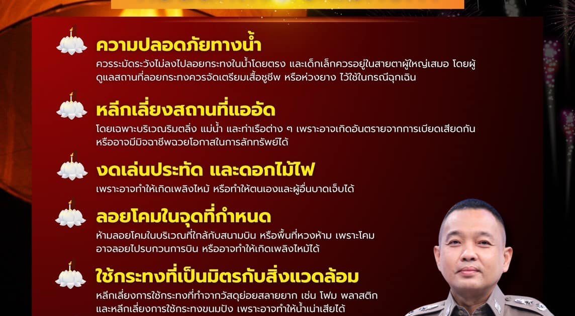 ดังนั้น เพื่อให้เทศกาลลอยกระทงเป็นไปอย่างปลอดภัย สนุกสนาน และไม่ทำลายสิ่งแวดล้อม สำนักงานตำรวจแห่งชาติจึงขอแนะนำ 6 สิ่งที่ต้องคำนึง ในช่วงเทศกาลลอยกระทง ดังนี้