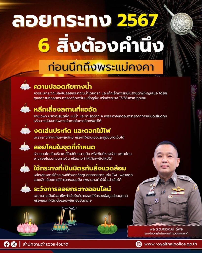 พล.ต.ต.ศิริวัฒน์ ดีพอ รองโฆษกสำนักงานตำรวจแห่งชาติ กล่าวว่า พล.ต.อ.กิตติ์รัฐ พันธุ์เพ็ชร์ ผู้บัญชาการตำรวจแห่งชาติ มีความห่วงใยประชาชนที่อาจตกเป็นเหยื่อของอาชญากรรมรูปแบบต่าง ๆ และเนื่องด้วยวันที่ 15 พฤศจิกายน 2567 ที่จะถึงนี้เป็น “วันลอยกระทง” ที่พี่น้องประชาชนร่วมเฉลิมฉลองด้วยการลอยกระทงตามแม่น้ำลำคลอง เพื่อขอขมาพระแม่คงคาและขอให้สิ่งไม่ดีลอยไปกับกระทง รวมไปถึงทางภาคเหนือยังมี “ประเพณียี่เป็ง” โดยเป็นการปล่อยโคมลอยหรือโคมไฟขึ้นสู่ท้องฟ้า เพื่อบูชาและขอขมาแม่คงคา เช่นเดียวกัน ซึ่งในช่วงเทศกาลดังกล่าวจะมีพี่น้องประชาชนออกมาร่วมกิจกรรมเป็นจำนวนมาก